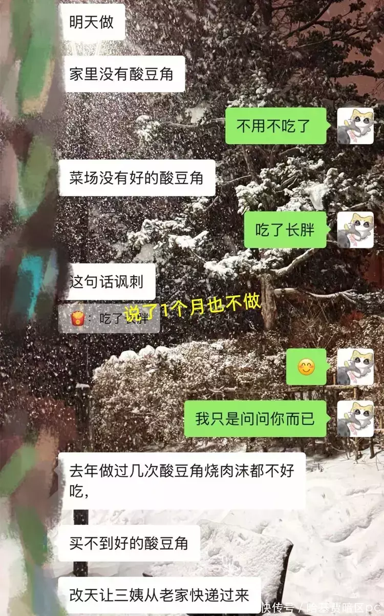 从记录里也能看得出来,她就是想让母亲炒酸豆角,不过母亲说家里没有豆角,也说市场上买的不好吃,让三姨从老家寄点过来,到时再炒酸豆角给她吃。