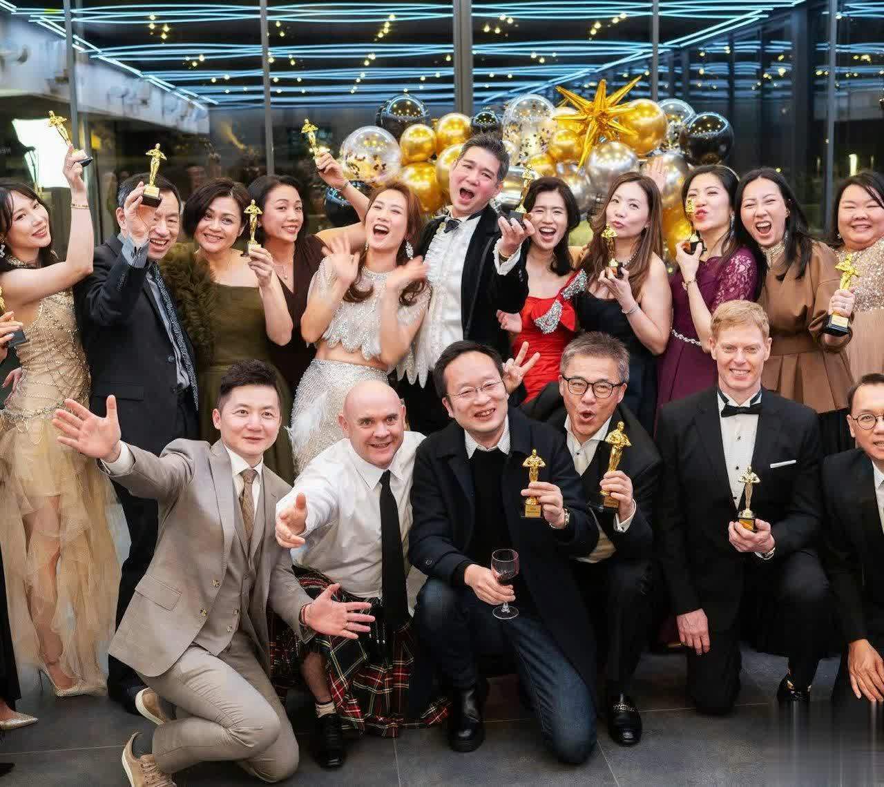 袁彩云的这场生日派对大概有20多人参加,都是她与丈夫在当地的亲友。大家都盛装出席,女性穿了礼裙或是礼服,男性穿了西装、礼服,还有一个男性外国人士穿了裙子,很有意思。在合照的时候,每个人手上都拿了一个小金人,袁彩云与丈夫站在中间,夫妻俩都表现得极为兴奋。袁彩云的丈夫罕见露脸,他穿了礼服,系了领结,他的头发看起来已经花白了,不过依然帅气有型,而且他的脸蛋泛红,大概是因为开心喝了不少酒,袁彩云挨着丈夫,双手张开,十分开心。