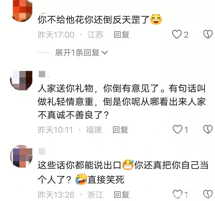 有人吐槽她是倒反天罡了,年龄比对方多十几岁,不给对方花钱就算了,还好意思吐槽对方的礼物廉价,也有人说还真把自己当个人了,这些话都敢说出口。