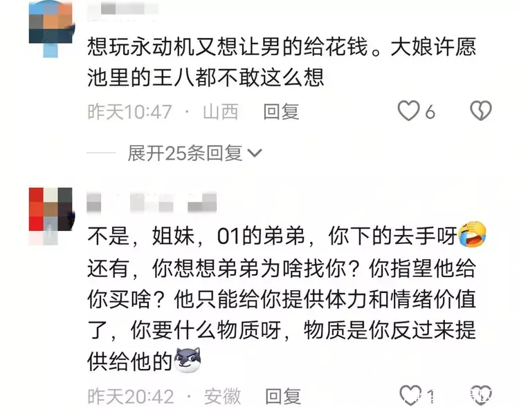 不过发到网上吐槽后,基本上也是让她破防了,大多数都觉得是她的问题,而不是那个小弟弟太油腻,毕竟她大对方10多岁了,应该是她送他礼物才对。