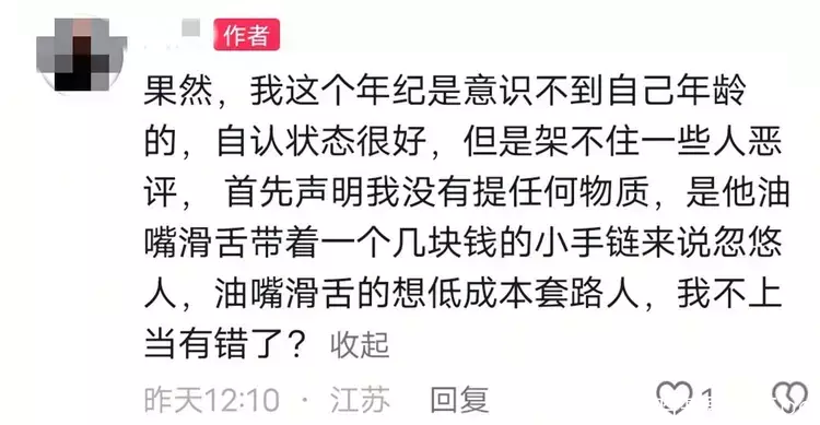 江苏就有位大姐吐槽起来了,她网恋了个小弟弟类型的,年龄比她小了10多岁,奔现时送了她手链,让她感觉挺廉价的,看着就像是地摊货。